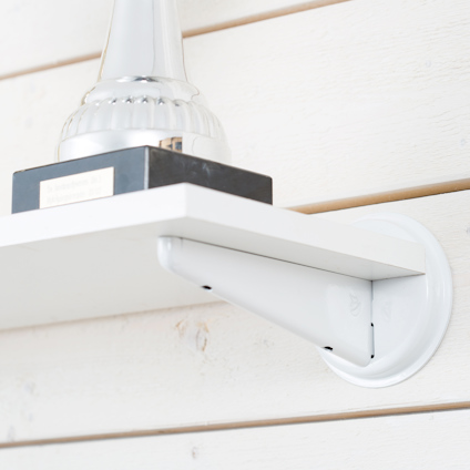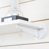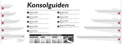 Används för montering av hyllor. Konsol hakas i häng- eller väggskena alternativt väggfäste. Passar en hylla som är 120-150 mm djup. Finns i fler storlekar. Läs mer