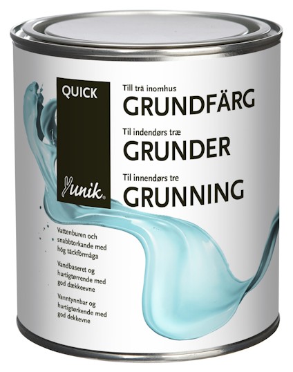 Yunik Grundfärg Trä V är en vattenburen och snabbtorkande grundfärg med bra vidhäftning på olika underlag. Bra utflytning ger ett jämnt skikt för efterföljande behandling. Lätt att slipa. Används inomhus som grundfärg till trä och tidigare målade ytor. Kan även med fördel användas som slipstrykningsfärg på grundmålade ytor av skivmaterial, rostskyddad metall m.m. Kan övermålas med vattenburen eller lösningsmedelshaltig täckfärg.