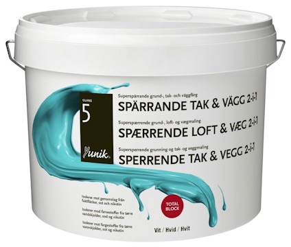Yunik Spärrgrund tak och vägg är en vattenburen spärrande grundfärg till tak och vägg som kan användas både som grund- och täckfärg. Ger en halvmatt, robust och tvättbar yta. Spärrar mot genomslag från fläckar av t.ex. fuktskada, nikotin och tusch. Används inomhus på väggar och tak av gips, betong, puts m.m., samt tidigare målade ytor.